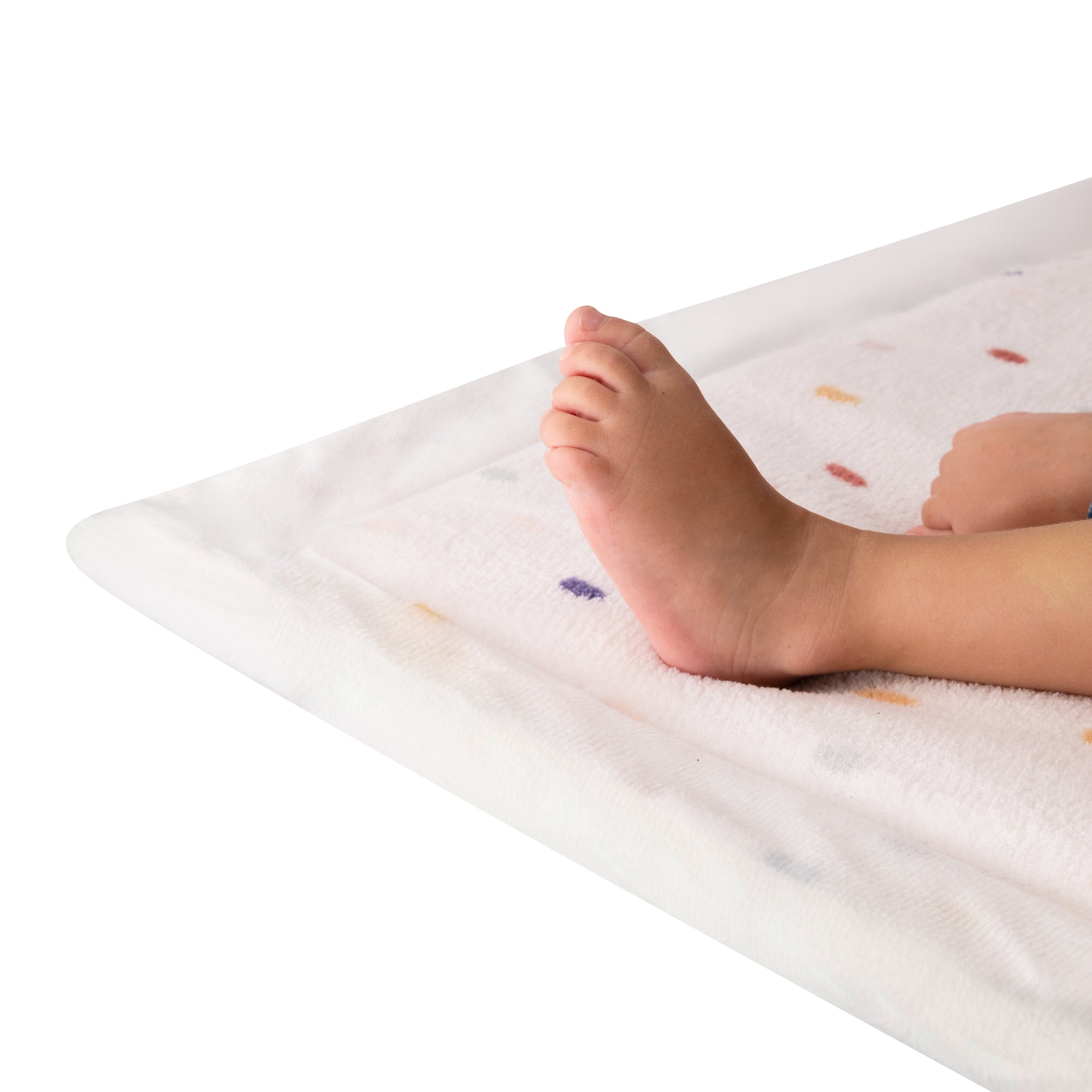Espuma de 3 cm de espesor, tela suave en cubierta y forro antiderrapante en parte inferior.